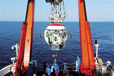 5月10日,“蛟龙”号载人潜水器从“向阳红09”科学考察船布放入水。 当日,“蛟龙”号载人潜水器首次迎来两位实习潜航员担任主、副驾驶下潜作业,这也是中国大洋38航次第二航段在南海的最后一潜。