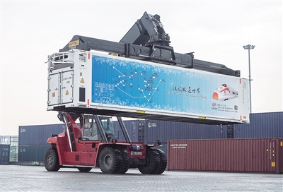 5月11日,在中欧(武汉)班列起点、武汉铁路集装箱中心站内,一辆集装箱起重机在往中欧班列上搬运货物。 中欧(武汉)班列自2012年开通以来,已开行545列,直达“一带一路”沿线28个亚欧国家、60余座城市。运输货物实载率达96%,货物总价值接近20亿美元。2016年,中欧(武汉)班列开行234列,加强了湖北与“一带一路”沿线国家的经贸合作与文化交流,让武汉成为连接中部地区与欧洲贸易的物流桥。