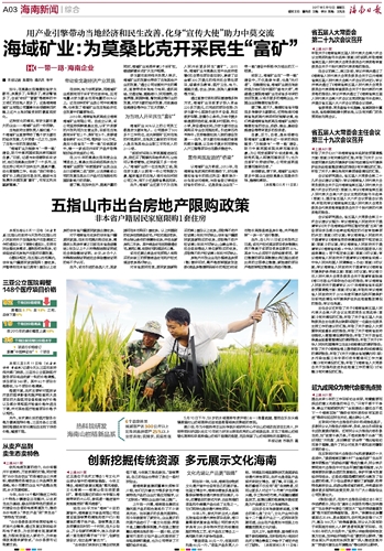 以海域矿业为桥梁,2013年,在海南省地质局的积极推动下,时任楠普拉省省长的西达利亚·曼努埃尔·沙乌克访问海南,与我省签订缔结友好省份的协议。这是我省企业在“一带一路”建设中积极作为结出的又一硕果。
