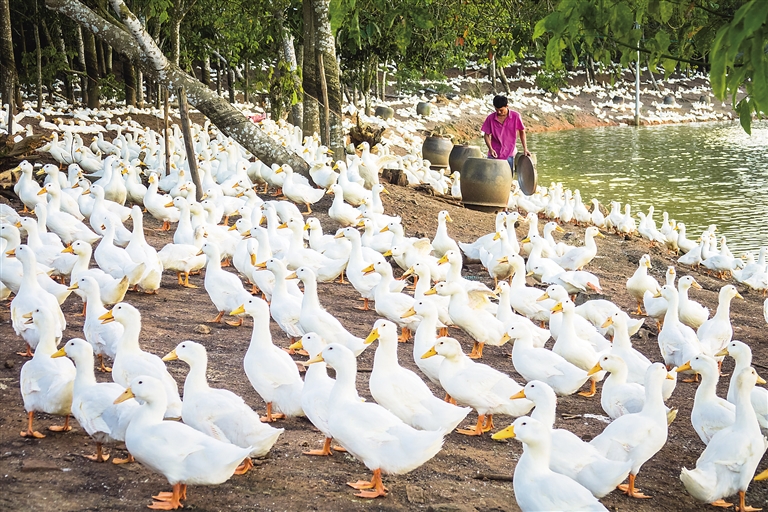 5月11日,儋州和庆镇美万新村村民彭兴在小山塘河畔为5000只白鸭喂饲料。