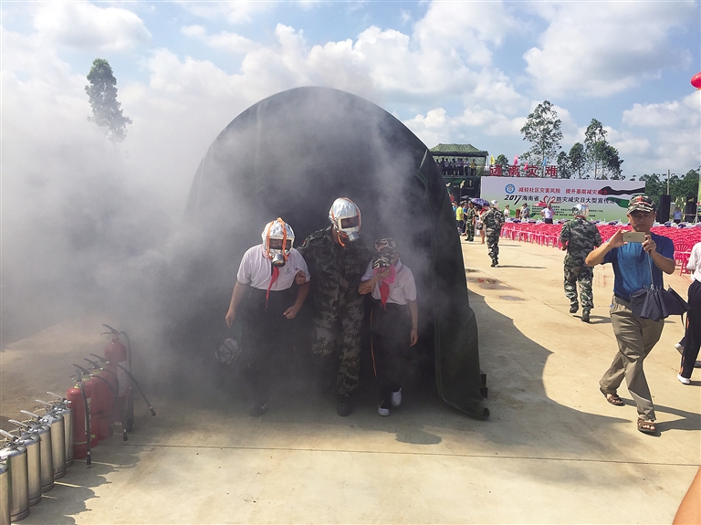 活动现场,全体人员首先起立为在5·12汶川特大地震灾害中遇难的同胞们默哀一分钟。随后,省消防总队消防官兵和海口二十六小的学生们参与了地震废墟模拟、校园快速疏散、地震全真模拟和斜屋体验、车辆逃生体验、烟带逃生体验等20多个实景体验和演练项目,300多名教育界及社会人士参与观摩。