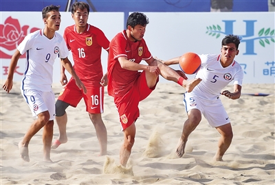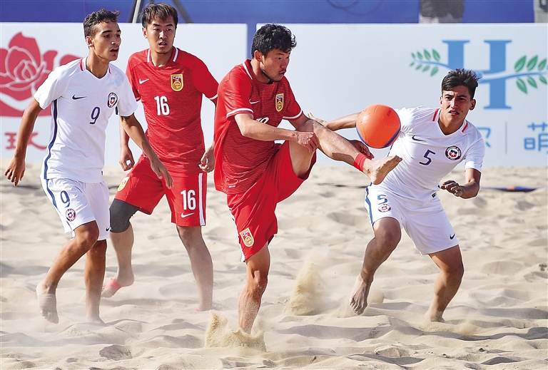 5月12日,在河北省唐山国际旅游岛举行的2017年国际沙滩足球邀请赛比赛中,中国队以2比1战胜智利队。