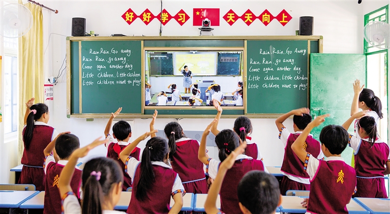 5月12日,位于陵水黎族自治县最偏远山区的大里希望小学,同学们通过“同步课堂”与县城北斗小学的同学们一起上英语课。从去年下半年开始,陵水实施“同步课堂”工程,目前已有21所中小学加入,采用“一拖二”模式,即一所县直属学校作为主课堂,两所乡镇学校作为分课堂,解决农村学校英语、音乐和美术等科目教师结构性缺编等问题。 本报记者 武威 通讯员 陈思国 摄