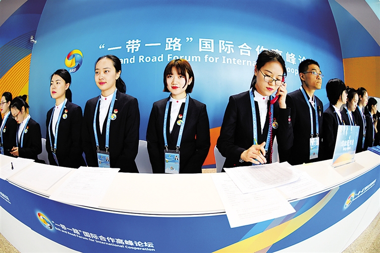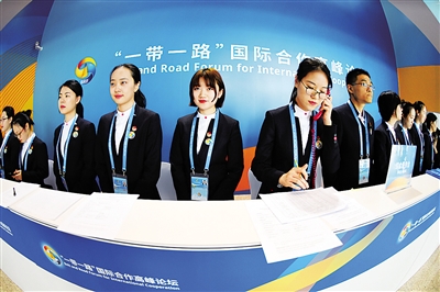 5月13日,志愿者在北京国家会议中心综合服务台等候为来宾提供服务。新华社记者 鞠焕宗 摄