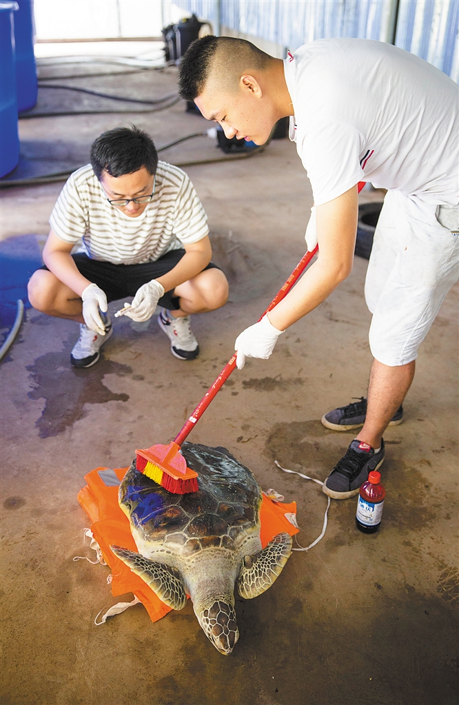 “我们用手或刷子摩擦海龟的背甲,它就用鳍撑起身体配合我们,不停摇摆,就像跳舞一样。”一说到海龟,志愿者王明的脸上就洋溢出灿烂笑容。