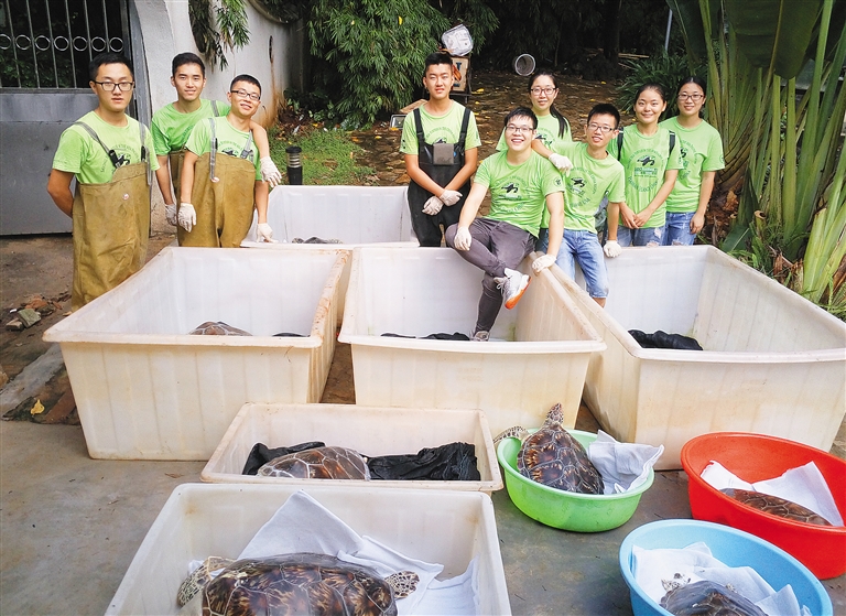 如今,海师海龟救助站志愿者团队已经成为海南救助海龟的专业队伍。一次,琼海边防部门查获罚没了96只海龟后,专门邀请志愿者团队对海龟进行体检,体检状态好的就放归大海,状态差的就留下来救治。