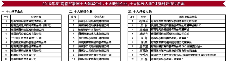 根据《海南省工业和信息化厅 海南省人力资源和社会保障厅关于印发2016年度“海南互联网十大领军企业、十大新锐企业、十大风云人物”评选活动实施方案的通知》(琼工信信产〔2016〕319号),省工业和信息化厅、省人力资源和社会保障厅组织成立评审委员会,对报名参选“十大领军企业”的57家企业、报名参选“十大新锐企业”的92家企业以及报名参选“十大风云人物”的79人进行了初评、网上投票及宣传、终评评审。现将终评通过的企业和个人予以公示。公示期:2017年5月15日—5月19日;如有异议,请在公示期内与省工信厅信息产业处联系。 海南省工业和信息化厅