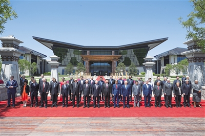 当天中午,习近平同与会领导人和国际组织负责人以国际会议中心“汉唐飞扬”主建筑为背景集体合影。