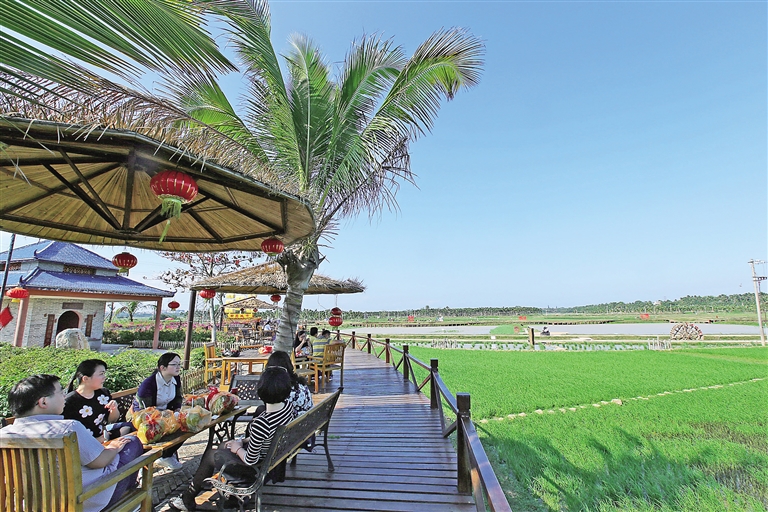走进琼海市会山镇沐塘村委会的加脑村,仿佛走进了一幅美丽的画卷:鹅卵石铺就的小道一直伸向“朋莱湾”(苗语:约会),万泉河水就从冠盖亭亭的河滨休闲园林中流淌而过;村中竹园曲径通幽,一间茶室隐秘其中,竹桌、竹椅、竹杯等满眼的竹元素别有情趣,品一杯五月茶,听着一旁的射弩场不时传出的欢笑声,颇有归园田居之感。在村中的哖嗦(苗语“吃饭”)苗家乐,一张长桌摆满了会山特色农家菜,加脑鹅、万泉河鱼、五脚猪、特色野菜让游客大快朵颐,直呼美味。