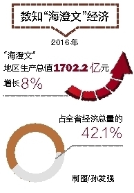 2016年,“海澄文”地区生产总值1702.2亿元,增长8%,占全省经济总量的42.1%。