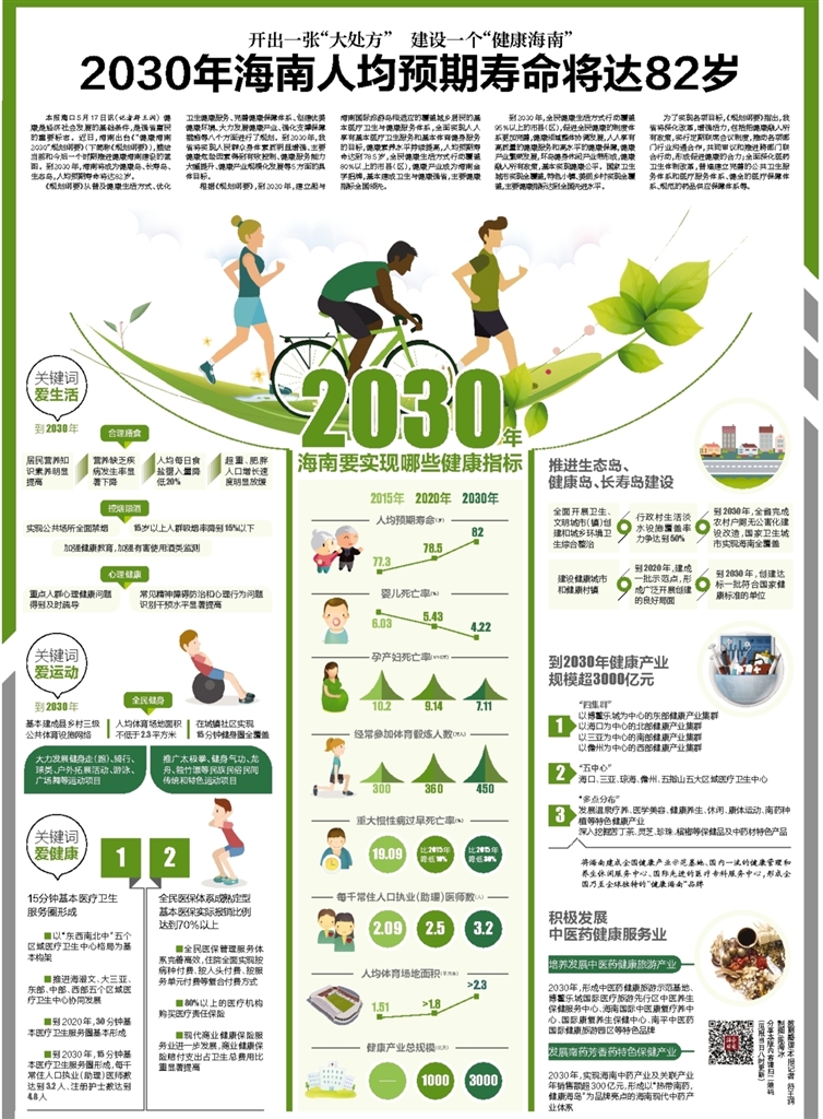 到2030年,全民健康生活方式行动覆盖95%以上的市县(区),促进全民健康的制度体系更加完善,健康领域整体协调发展,人人享有高质量的健康服务和高水平的健康保障,健康产业繁荣发展,环岛健身休闲产业带形成,健康融入所有政策,基本实现健康公平。国家卫生城市实现全覆盖,特色小镇、美丽乡村实现全覆盖,主要健康指标达到全国先进水平。