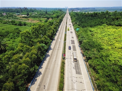 澄迈县金马大道,宽阔的道路上被修补过的地方仍不平整,坑坑洼洼,让坐车人饱受颠簸,叫苦不迭。本报记者 袁琛 摄