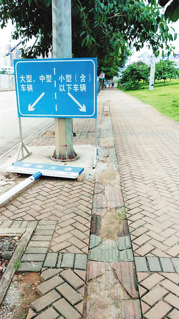 海口椰海大道与学院路交汇处,喜盈门家居广场门前,一段十余米长的盲道破损严重。 本报记者 丁平 摄