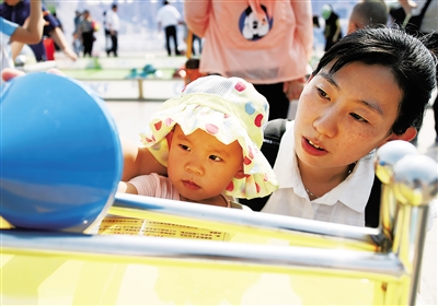 5月20日,一位家长带着两岁的孩子在济南科技活动周现场体验“会爬坡的球”趣味实验。 当日,山东省举行科技活动周系列活动,普及科学知识,弘扬科学精神。
