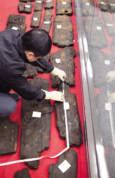 记者在现场采访时,工作人员在平面铁架上依次摆放了大小约20块船板,之所以摆放在这样仅有简单支撑框架的铁架上就是为了尽可能保证“四面通透”,让扫描仪无论处于上下左右任何一个位置都可以扫描到船板。