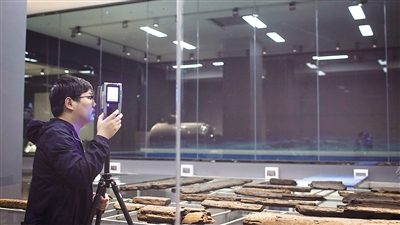“这些船板残骸之前全部都使用米尺测量过,但因形状不规则等原因,会存在误差,想要精确、严谨地复原这艘古船,数据就要精准,而三维激光扫描技术可以将他们的尺寸精确到毫米。”省博物馆文物保护与修复部副主任包春磊博士介绍道。