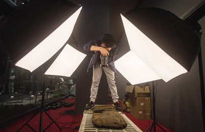 通俗来讲,照片就是墙纸、三维扫描获得的模型就是虚拟墙面,假如真实的墙面上有一个孔,那么拍摄出来的“墙纸”上的这个孔在贴图时就要与虚拟“墙面”上的这个位置精准贴合。以真实船板被腐蚀严重的豁口而言,几乎有几个“坑”就要拍几张照。工作人员在给一片约40厘米长、30厘米宽的船板拍照时说,像这样一块船板,至少要拍摄50至60张照片才能保证每一寸纹理都被清晰捕捉。一个摄影师每天对着船板要拍摄约1000张图。