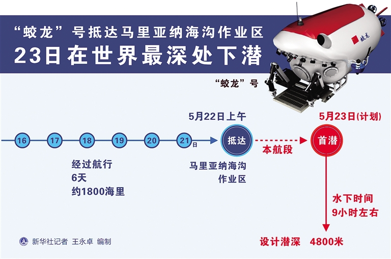 本航段是“蛟龙”号自2013年进入试验性应用阶段以来的最后一个航段,调查海域位于西北太平洋马里亚纳海沟和雅浦海沟深渊区。现场指挥部与深潜作业部门、科学家团队对本航段潜次及下潜人员根据实际情况进行了具体安排,计划本航段“蛟龙”号将进行10次深潜。23日进行的本航段首潜,设计潜深为4800米,水下时间9小时左右。
