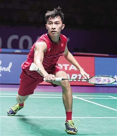 5月22日,在澳大利亚黄金海岸举行的2017年苏迪曼杯世界羽毛球混合团体锦标赛小组赛中,中国香港队以2∶3不敌泰国队。图为中国香港选手伍家朗在男单比赛中。 新华社发