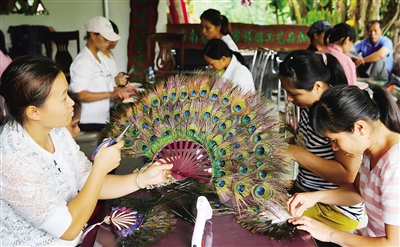 据介绍,2013年23位农民加入了儋州市南丰镇马荷村瑞烨农民孔雀养殖合作社。今年上旬,山东、上海、浙江横店影视城及本省孔雀羽毛扇订单接踵而至。4月份,合作社创建了旅游工艺品加工厂,招收当地20名心灵手巧的妇女入厂,其中有8户贫困户,月工资达2000元。