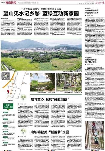 作为海棠区美丽乡村建设的阶段性成果,青塘村成为该区的绿色旅游模块的“先锋军”。“青塘村将休闲旅游与儿童户外教育相结合,与北山村组成了美丽乡村路线,再加上以高端度假酒店为代表的海滨度假带、以南田温泉为代表的温泉养生游、以水稻公园田野狂欢为代表的文化旅游等,形成了多门类的‘旅游+’体验。”海棠区区委书记刘冲表示,产业跨界展现了海棠区多样的旅游产业模式,助力三亚旅游模式从“蓝色旅游”走向“蓝绿旅游”相结合,从滨海旅游时代向全域旅游时代转变。