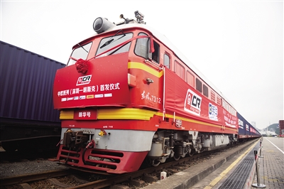 这是5月22日在深圳盐田港拍摄的深圳首趟中欧班列。 5月22日,设有41节车厢的X8428次列车从广东深圳盐田港启程,搭载着货物驶向白俄罗斯明斯克市,这是深圳开行的首趟中欧班列。该班列将从新疆阿拉山口出境,途径哈萨克斯坦、俄罗斯等国,运行总里程约9900公里,预计运行时间13天。此班列初期实行单线(出口)运输,频次为一周一班。 新华社记者 毛思倩 摄