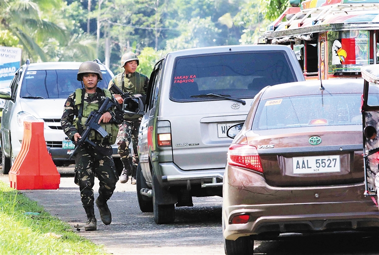 5月24日,在菲律宾南拉瑙省,士兵盘查经过的车辆。 据菲律宾媒体报道,正在俄罗斯访问的菲律宾总统杜特尔特23日宣布在菲南部棉兰老岛等地区实施为期60天的戒严,以应对目前棉兰老岛上政府军警与“毛特组织”等反政府武装的战斗。新华社发