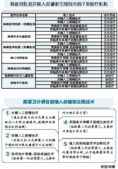 我省7家医疗机构的辅助生殖技术主要有夫精人工授精、第一代试管婴儿技术和第二代试管婴儿技术。目前,能够进行供精人工授精的机构仅为海南医学院第一附属医院一家。
