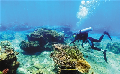 5月24日,陵水黎族自治县分界洲岛旅游区“海底牧场”珊瑚保育区,工作人员在进行珊瑚生长情况巡检。近年来,该旅游区主动联合国家有关海洋研究部门在海底开展珊瑚培育,通过抛投人工礁体、废旧渔船等方式,加强海底珊瑚人工繁育。 本报记者 张杰 通讯员 童国强 摄