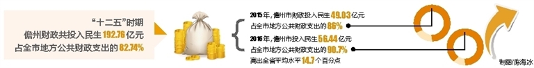 据儋州市政府统计,“十二五”时期,儋州财政共投入民生192.76亿元,占全市地方公共财政支出的82.74%。2015年,儋州市财政投入民生49.03亿元,占全市地方公共财政支出的86%;2016年,儋州市投入民生56.44亿元,占全市地方公共财政支出的90.7%,高出全省平均水平14.7个百分点。