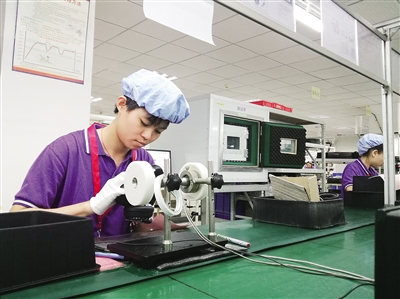 张媛僖从事的工作很简单,坐在流水线上手持镊子为耳机听筒安装上共振线圈,再交给下一位工友操作。这个简单的动作不超过3秒钟,动作必须连贯,要跟得上传送带的速度。