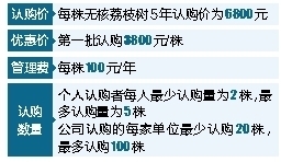 每年荔枝上市时,陆侨荔枝总是供不应求。为确保无核荔枝爱好者每年都能尝到新鲜的果品,同时造福当地果农,陆侨农牧开发有限公司从今年起面向全国推出果树认购活动。其中,每株无核荔枝树5年认购价为6800元,第一批认购优惠价3800元,每株荔枝树的管理费为100元/年,认购者拥有果实收获权,同时陆侨农牧公司将每年向认购者供应20斤陆侨无核荔枝。