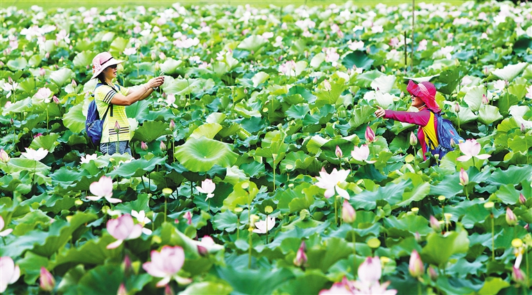 5月24日,临高皇桐镇金波村200亩荷花扶贫产业基地,游客在赏花拍照。据了解,该项目采取公司+基地+贫困户模式运营,全村25户贫困户每户以1000元入股并参与荷花种植,按总盈利的50%分红。今年镇政府投入30万余元,在该基地修建旅游配套设施,吸引更多游客。本报记者 苏晓杰 特约记者 吴孝俊 摄