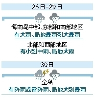 气温方面,28日-30日,全岛最高气温30~33℃,最低气温22~25℃。海洋方面,海南岛南部和东部近海海面风力5~6级、阵风7~8级;琼州海峡和海南岛西部近海面风力4~5级、阵风6~7级。