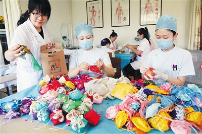 5月26日,沧州中西医结合医院的医师在制作中药香囊。端午节前夕,河北省沧州中西医结合医院制作含有冰片、石菖蒲、薄荷等18种中药材的香囊,具有提神醒脑、防蚊虫等功效,受到市民青睐。 新华社发