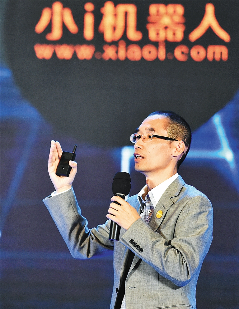 当日,小i机器人创始人袁辉在博览会的主题活动“机器智能”高峰对话现场演讲。新华社发