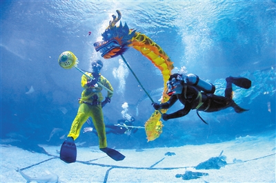 5月27日,潜水员排练“水下舞龙”节目。 当日,山东烟台海昌鲸鲨海洋公园的潜水员们精心排练“水下舞龙”节目,迎接即将到来的端午节假期。 新华社发(唐克 摄)