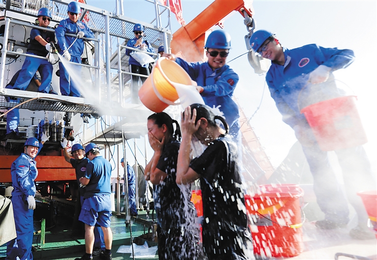 5月27日,女科学家张维佳和女潜航学员赵晟娅归来受到“洗礼”。 “蛟龙”号载人潜水器继5月23日在世界最深处的马里亚纳海沟北坡首潜后,25日和27日又分别在南坡和北坡进行了一次6000米级大深度下潜,获取了深渊生命演化和生物对深渊环境适应机制研究的大量第一手资料和样品。 27日完成的马里亚纳海沟第3潜,也是中国大洋38航次第三航段第3潜。 新华社发