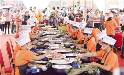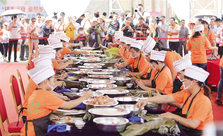 5月28日,定安天九美食文化广场,由20名定安娘子组成的包粽子队伍,在1个小时内共包完631个粽子,成功挑战吉尼斯世界纪录。此次挑战是2017年海南(定安)端午文化美食节设置的特色活动之一。