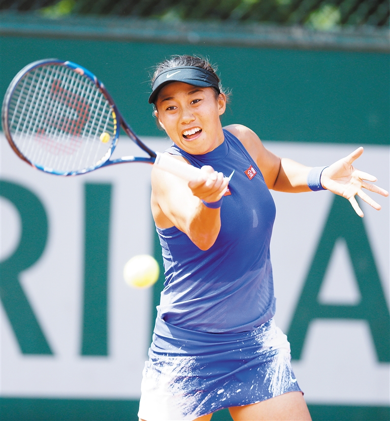 5月29日,在巴黎进行的2017法国网球公开赛女子单打第一轮比赛中,中国选手张帅以2:0战胜克罗地亚选手韦基奇,进入第二轮。图为张帅在比赛中回球。 新华社记者 韩岩 摄