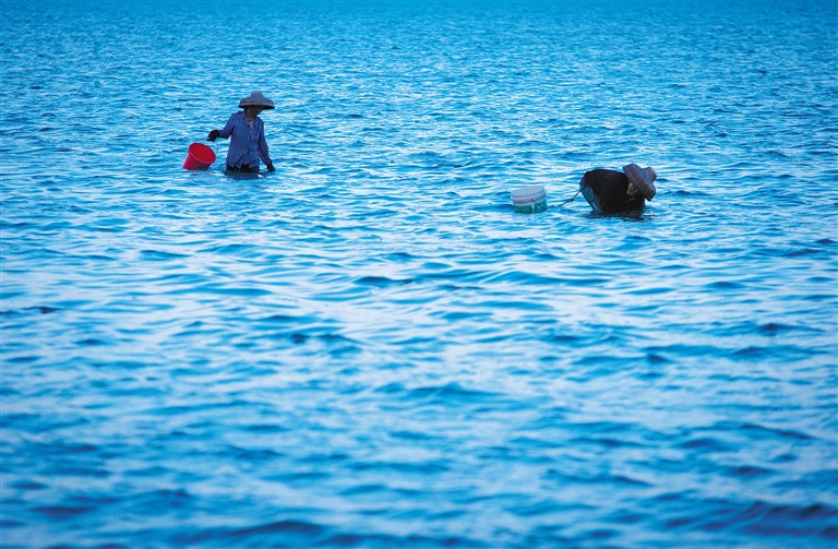 对于游客来说,最佳赶海时间为农历4月到8月份的每月初一、十五及之后三天的下午时分。那时,早上还碧波万顷的潭门湾,到了下午,夕阳溢出余辉,潮水慢慢退至3公里外,露出开阔而平缓的浅滩,成为少有的优质赶海场所。