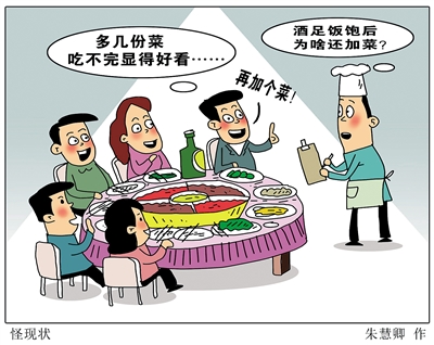 几年前流行的“光盘行动”,伴随着“厉行节约、反对浪费”的倡议,一度让人们兴起了适量点菜、打包之风。然而,近来媒体调查发现,舌尖上的浪费又有所回潮。宴请时,主人觉得“光盘”不好看;吃不完,许多年轻人都不怎么打包。其实,避免浪费的道理大家都懂,但畸形的面子观念又总是在推波助澜。这正是: