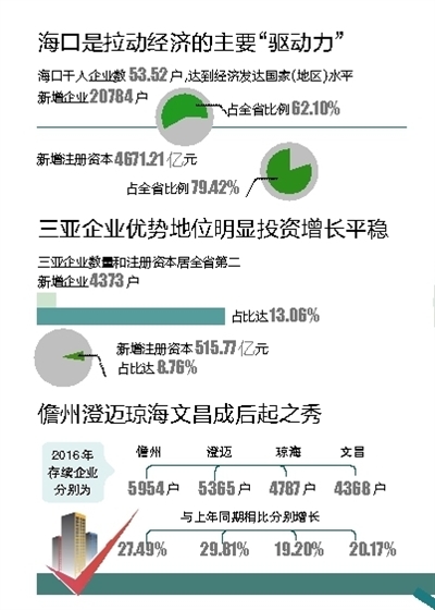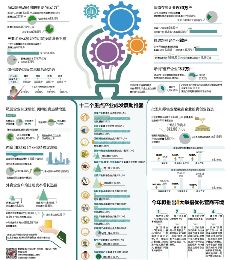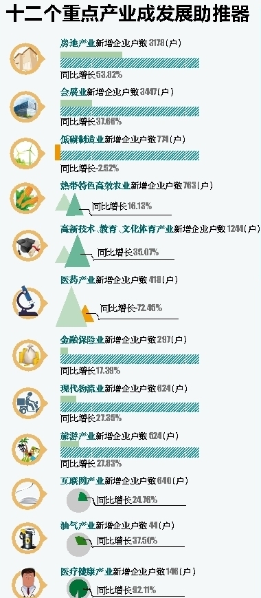 2016年,海南重点发展的十二个产业中,旅游、互联网、医疗健康、金融保险、会展、现代物流、房地产和高新教文体等8个产业的企业数量和注册资本同比均明显增长。医疗健康产业凭借我省优质的生态环境、先行先试的特殊政策以及宽松的投资环境,吸引较多资本进入,企业数量与2015年相比增长接近翻倍,增幅最快;旅游产业依托海南得天独厚的自然环境和各市县各镇的旅游文化,大批旅游项目落地,注册资本同比增长了1494.57%,不断推动旅游业转型升级;高新技术、教育、文化体育产业结合国家“一带一路”建设和国际旅游岛建设需要,乘“互联网+”东风,激发新思维,注册资本同比增长达443.81%。
