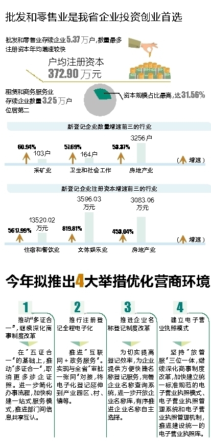 2016年,企业“五证合一、一照一码”、 个体户“两证整合”、“企业简易注销”、“一址多照、一照多址”登记、“信箱地址”注册、“网上登记公众服务”等商事制度改革相继在全省实施,改革红利不断释放,市场活力得到有效激发,企业数量和注册资本总额持续稳定增长。