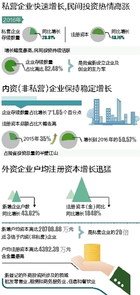 省工商局负责人告诉记者,2016年全省私营企业数量大,体量小,是大众创业万众创新的主力军;内资企业投资增速显著,注册资本占比大幅增长,有“国进民退”的发展态势;外商投资企业含金量高。总体而言,2016年我省企业呈现“量增价涨”的良好发展态势,各路资本高歌猛进。