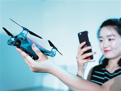 5月31日,一位媒体记者在新品见面会上用手机拍摄大疆推出的“晓”Spark掌上无人机。 新华社记者 陈建力 摄
