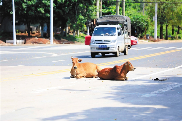 6月1日,在澄迈老城镇,几头黄牛当街躺着休息,过往的车辆只能绕着走,影响交通安全。
