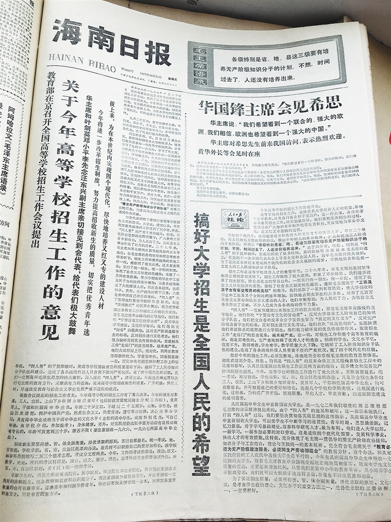 1977年10月21日,一大清早,街头巷尾的《海南日报》就一售而空。报纸在头版头条的位置刊发了一条新闻:《教育部在京召开全国高等学校招生工作会议提出关于今年高等学校招生工作的意见》。