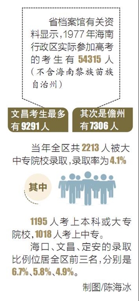 罗经纬掰着手指头数:那一年,教育部宣布恢复全国高等院校招生考试制度,一个刚刚走出狂热的国家逐渐回归理性;那一年,有8.5万名海南行政区的考生报名参加高考,是海南历史上报名参加高考人数最多的一年;那一年,在实际参加考试的54315名海南行政区考生中,有2213人被普通大中专学校录取,从此走上了与前不同的人生道路。