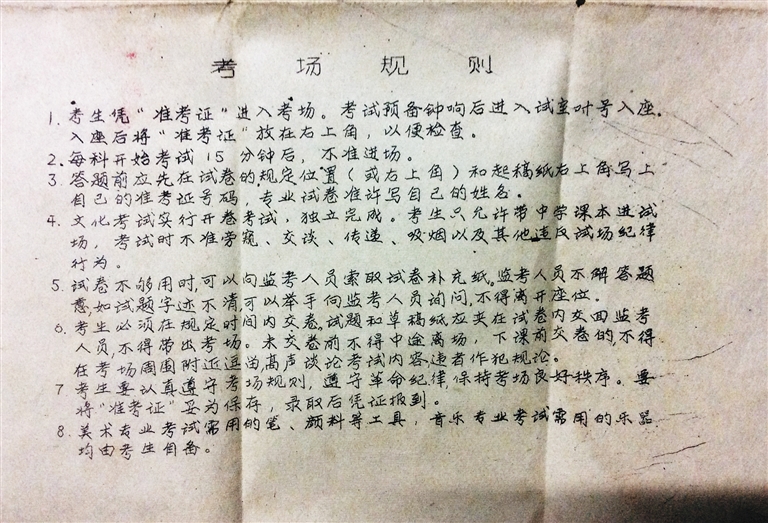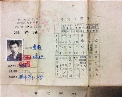 “我当时是从海南日报上看到恢复高考的消息的,第一感觉就是希望来了。”海南大学艺术学院教授王家儒是海口人,1968年初中毕业后,因为年龄太小而没能成为知青,留在海口城内学画画、搞美术创作。到1977年,他的画已经小有名气。当恢复高考的消息传来,没有上过高中的他,也立志要参加高考。他选择考的是美术院校。当年,广州美术学院派出专门的老师在海口租用了海口一小的校舍,设立了考点。美术高考与普通高考不一样,要求首先递交自己的美术作品,作品达到要求了才能参加考试。